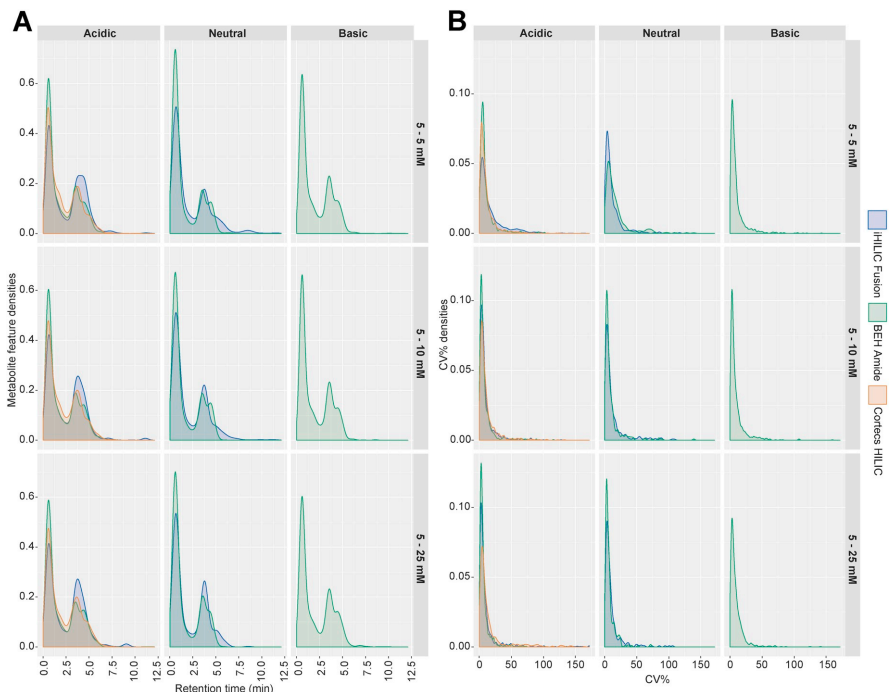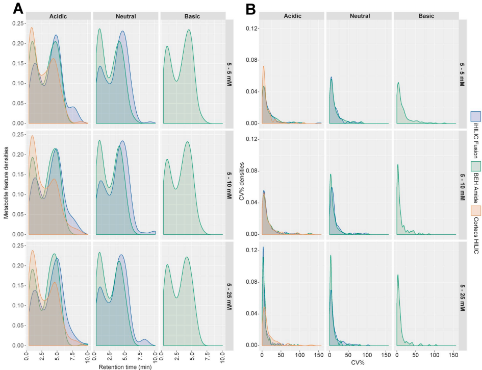 优选的情况,应在整个保留时间轴上有统一的保留时间分布,并在空隙体积中检测到尽可能少的化合物。iHILIC Fusion在酸性条件下表现出最佳的保留时间分布和精度,正模式下密度在0-2.5分钟之间最低,在2.5-7分钟之间最高。三次重复注射的精度总体良好,酸性条件下和5-25 mM NH4Ac浓度的iHILIC Fusion表现最佳。