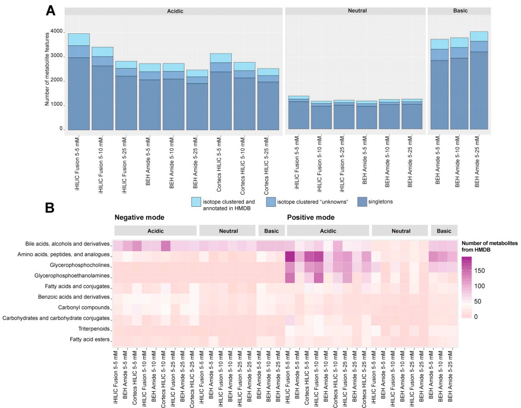 这篇文章的研究系统地比较了三种不同的HILIC柱(两性离子型、酰胺基型和未键合硅胶型)在不同pH值(酸性、中性和碱性)和盐梯度条件下的性能,;研究涵盖了150种内源性化合物和婴儿粪便样本,评估了这些化合物在不同条件下的检测数量、同分异构体的分离、色谱运行中的分布和精度;通过实验找到了最适合非目标代谢组学分析的HILIC方法,特别是在酸性条件下使用两性离子型 iHILIC Fusion柱,在酸性条件下,iHILIC Fusion柱表现出最高的检测标准和代谢物特征数量,并且在整个色谱运行中具有良好的特征分布和精度;研究结果表明,iHILIC Fusion柱在酸性条件下对氨基酸和碳水化合物的覆盖效果最佳,而BEH Amide柱在碱性条件下对胺类和脂肪酸的覆盖效果较好。