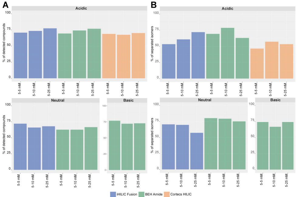 本文比较了三种不同的机理的亲水作用HILIC色谱柱在酸性、中性和碱性pH以及增加的缓冲盐梯度条件下的性能。评估了这些条件在检测特征数量、同分异构体分离、色谱运行中的分布和精度方面的表现。主要目标是找到一种覆盖粪便中极性代谢物最广的HILIC方法。结果表明,两性离子型的亲水作用 iHILIC Fusion色谱柱在酸性条件下提供了最佳的检测特征数量和代谢物类别覆盖率,适用于未来的非靶向代谢组学研究。